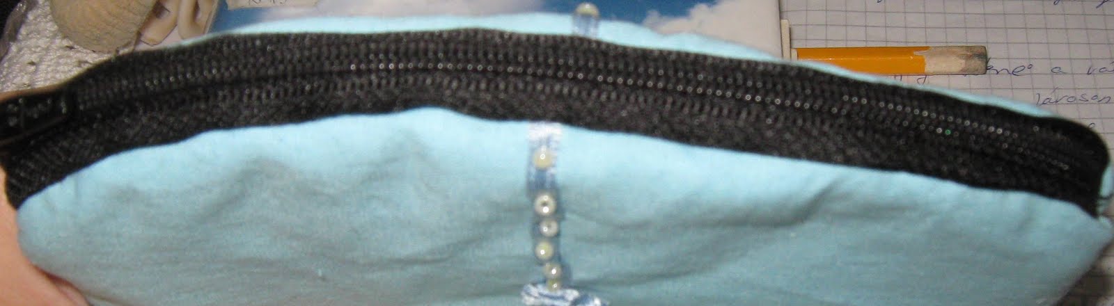 Az anyag eredetileg egy sima kék anyag amire rávarrtam kézzel a szalagot.Hogy ne látszodjon,hogy kézzel van varrva igy damilal varrtam és varrtam rá gyöngyöket és egy masnit amit a "villán megkötéses" technikával készitettem.